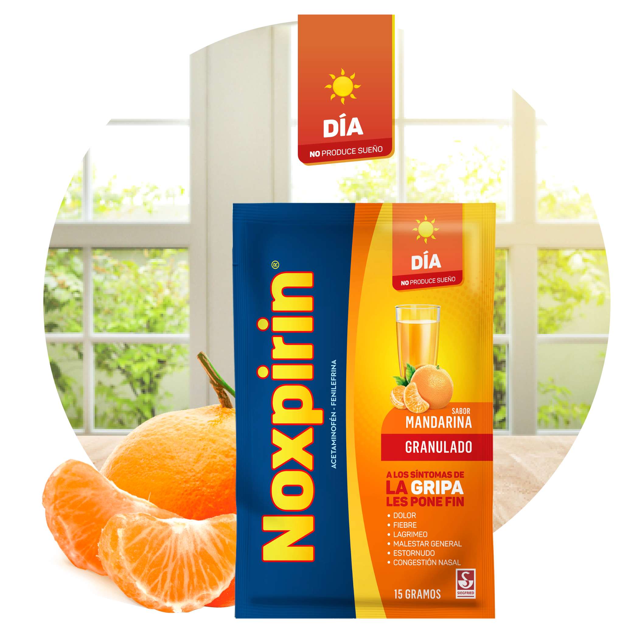 Medicación sintomática del resfriado común. Es un medicamento. No exceder su consumo. Leer indicaciones y contraindicaciones en la etiqueta. Si los síntomas persisten, consulte a su médico. Medicamento de venta libre. Noxpirin® Día. Registro sanitario No. INVIMA 2010M-0010679. Los