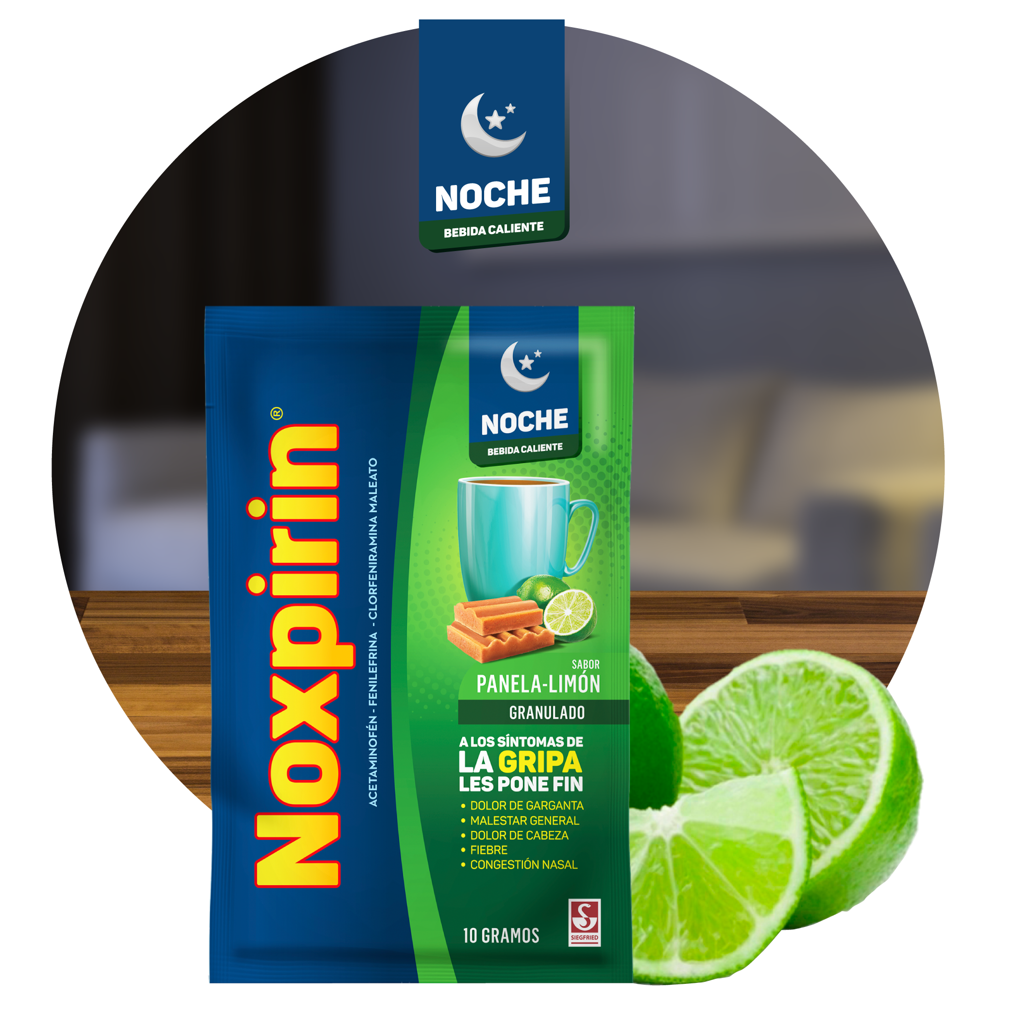 Tratamiento sintomático del resfriado común. Es un medicamento. No exceder su consumo. Leer indicaciones y contraindicaciones en la etiqueta. Si los síntomas persisten, consulte a su médico. Medicamento de venta libre. Noxpirin® Caliente Noche. Registro sanitario No. INVIMA 2020M-0013331-R1